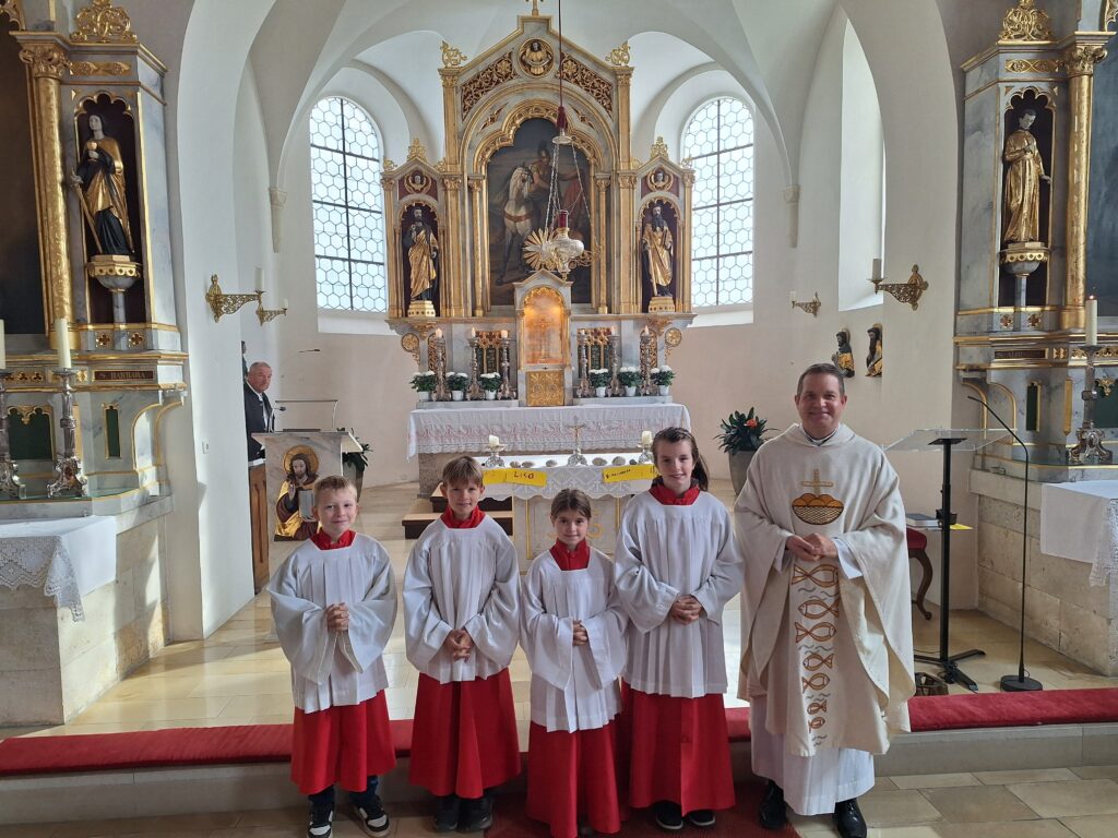 „Am Kirchweihsonntag wurden in der Pfarrgemeinde Theißing im Rahmen des Gottesdienstes feierlich 4 neue Ministranten (Lukas, Franz-Joseph, Lisa und Sophie) in die Schar der Messdiener aufgenommen. Pfarrer Wilhelm Karsten bedankte sich bei den Minis und deren Familien für die Bereitschaft zur Übernahme dieses Dienstes. Wir wünschen unseren Ministranten viel Freude und Gottes Segen für ihren Dienst!“